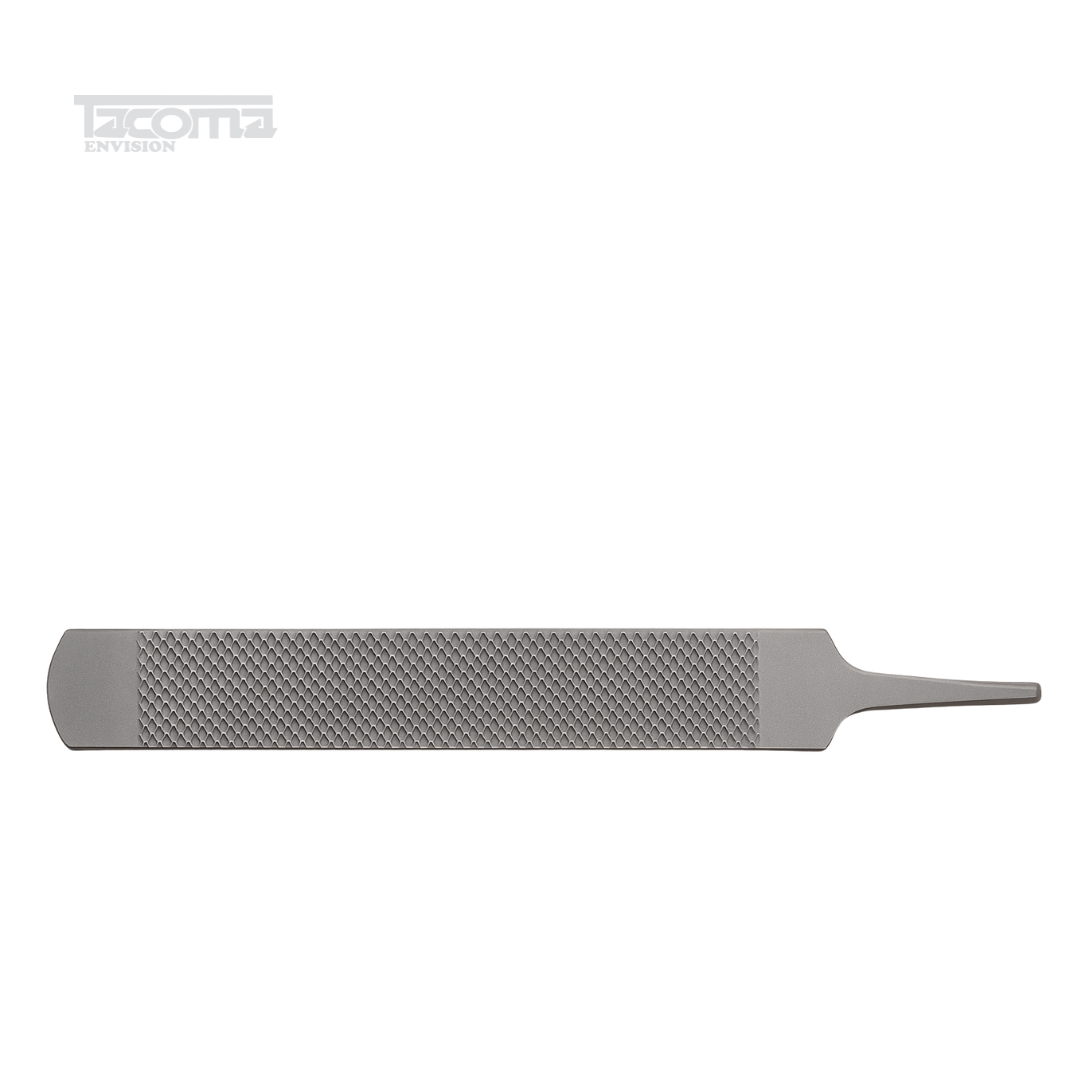 This rasp features a double-sided cutting surface—a coarse side for rapid removal of hoof material and a fine side for smooth finishing. The tang-style end allows attachment of a wooden or rubber handle for improved control, comfort, and leverage during hoof trimming. Its long, flat body ensures balanced pressure and precise hoof shaping, delivering consistent results during routine and corrective trimming.